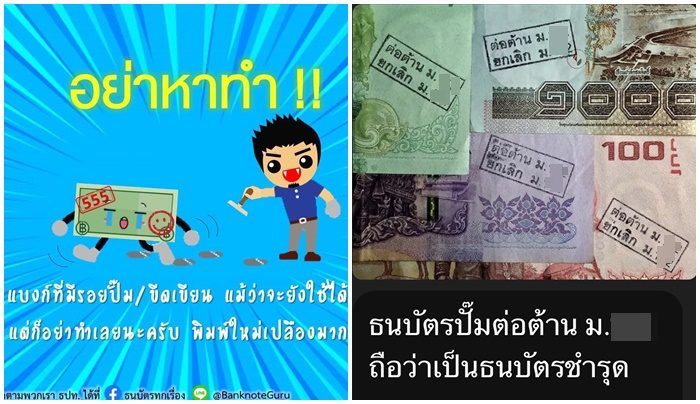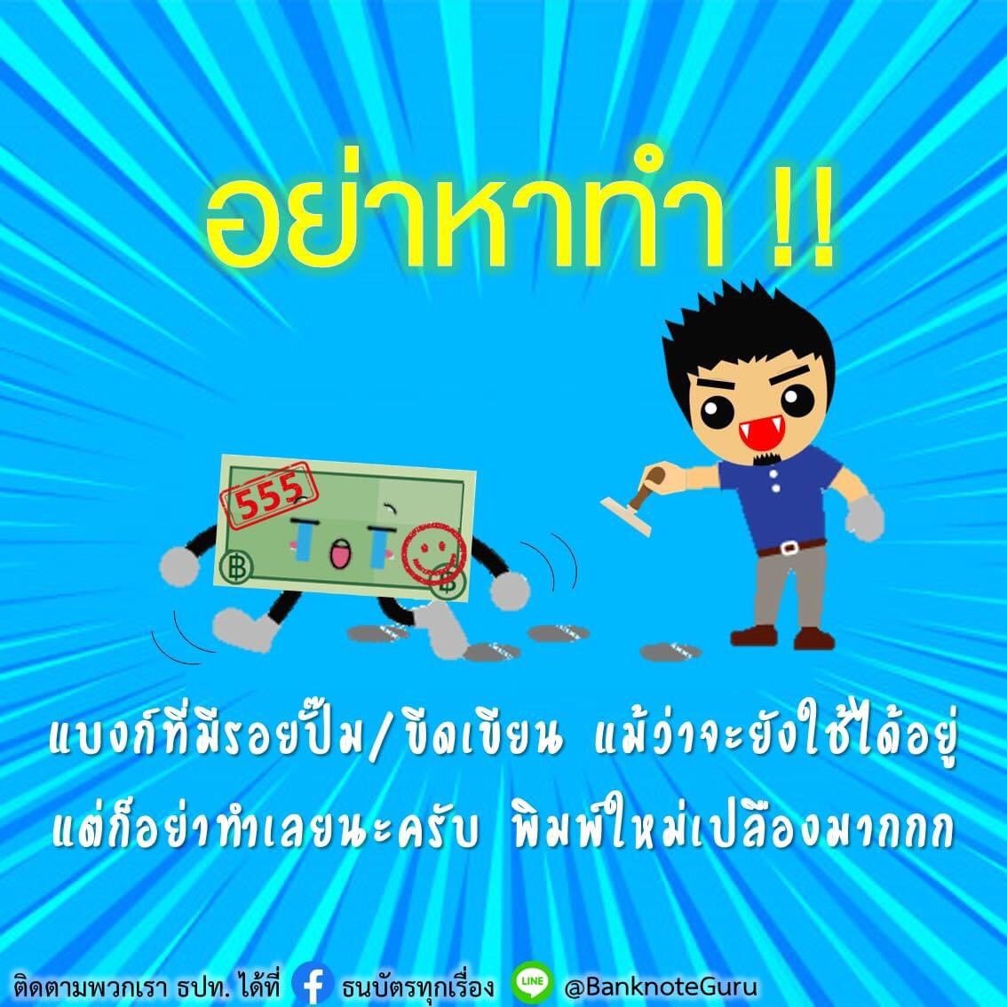 ธนาคารแห่งประเทศไทย (ธปท.) ขอประชาสัมพันธ์ ดังนี้ ธนบัตรที่มีรอยประทับตราหรือขีดเขียนข้อความใด ๆ ยังสามารถใช้ชำระหนี้ได้ตามกฎหมาย แต่ไม่ควรนำออกใช้ต่อไป เพราะมีสภาพไม่เหมาะสมต่อการใช้หมุนเวียน เนื่องจากรอยเปรอะเปื้อนอาจทำให้พิสูจน์ได้ยากว่าเป็นธนบัตรจริงหรือธนบัตรปลอม ซึ่ง ธปท. จะดำเนินการนำออกจากระบบและพิมพ์ธนบัตรใหม่ทดแทน เพื่อให้ธนบัตรหมุนเวียนเพื่อการใช้งานของประชาชนเป็นธนบัตรที่สะอาดและน่าใช้ตามมาตรฐานที่ ธปท. ได้กำหนดไว้