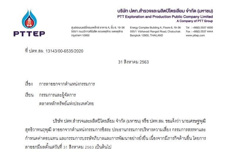 วันที่ 31 สิงหาคม 2563 บริษัท ปตท.สำรวจและผลิตปิโตรเลียม จำกัด (มหาชน) หรือ ปตท.สผ. แจ้งตลาดหลักทรัพย์ฯ ว่า นายเศรษฐพุฒิ สุทธิวาทนฤพุฒิ ได้ยื่นลาออกจากตำแหน่งกรรมการอิสระ ประธานกรรมการบริหารความเสี่ยง กรรมการสรรหาและกำหนดค่าตอบแทน และกรรมการบรรษัทภิบาลและการพัฒนาอย่างยั่งยืน เนื่องจากมีภารกิจด้านอื่น โดยการลาออกมีผลตั้งแต่วันที่ 31 สิงหาคม 2563 เป็นต้นไป